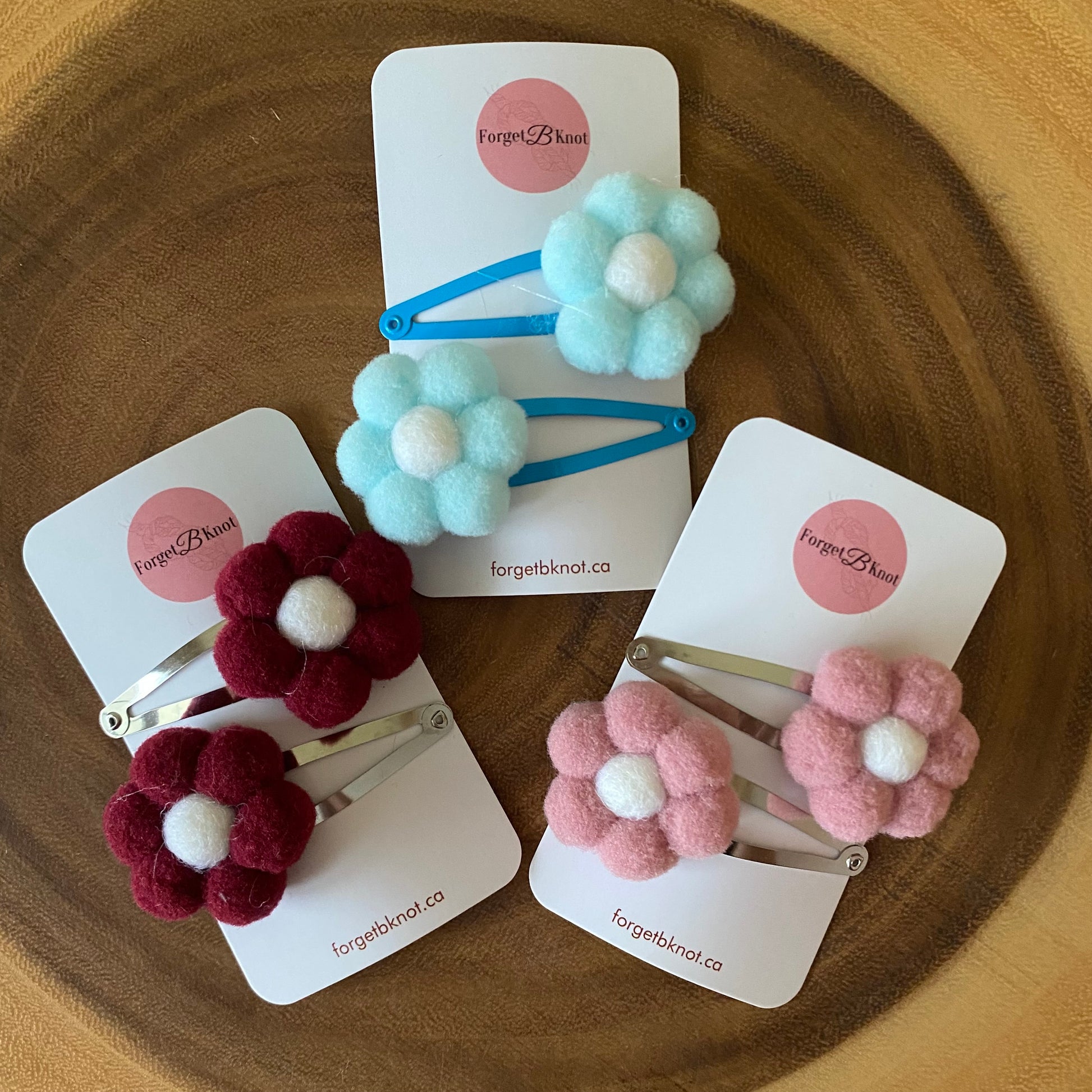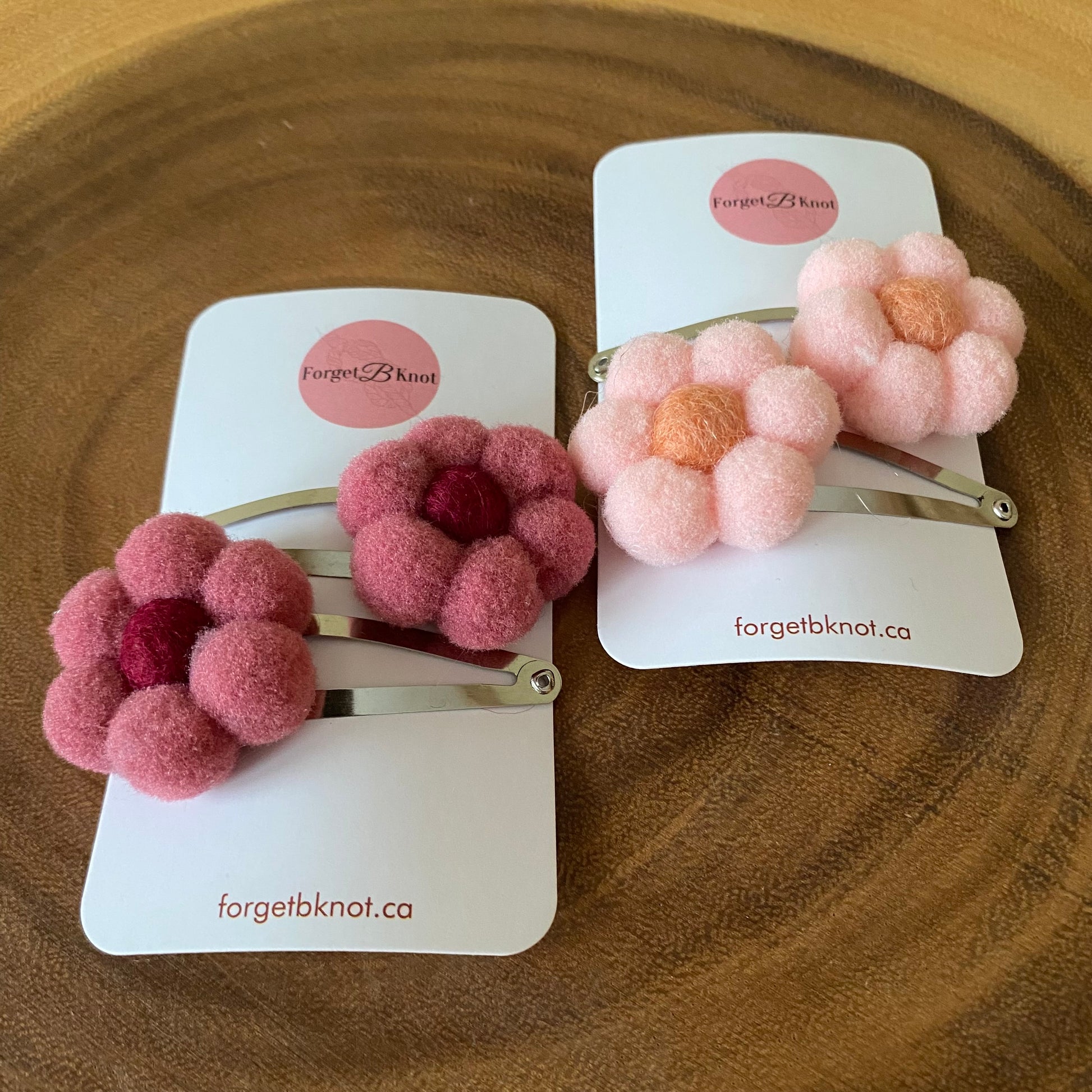 Design: Each clip features soft pompoms hand sewn around a felt ball center. Flowers are backed in felt.