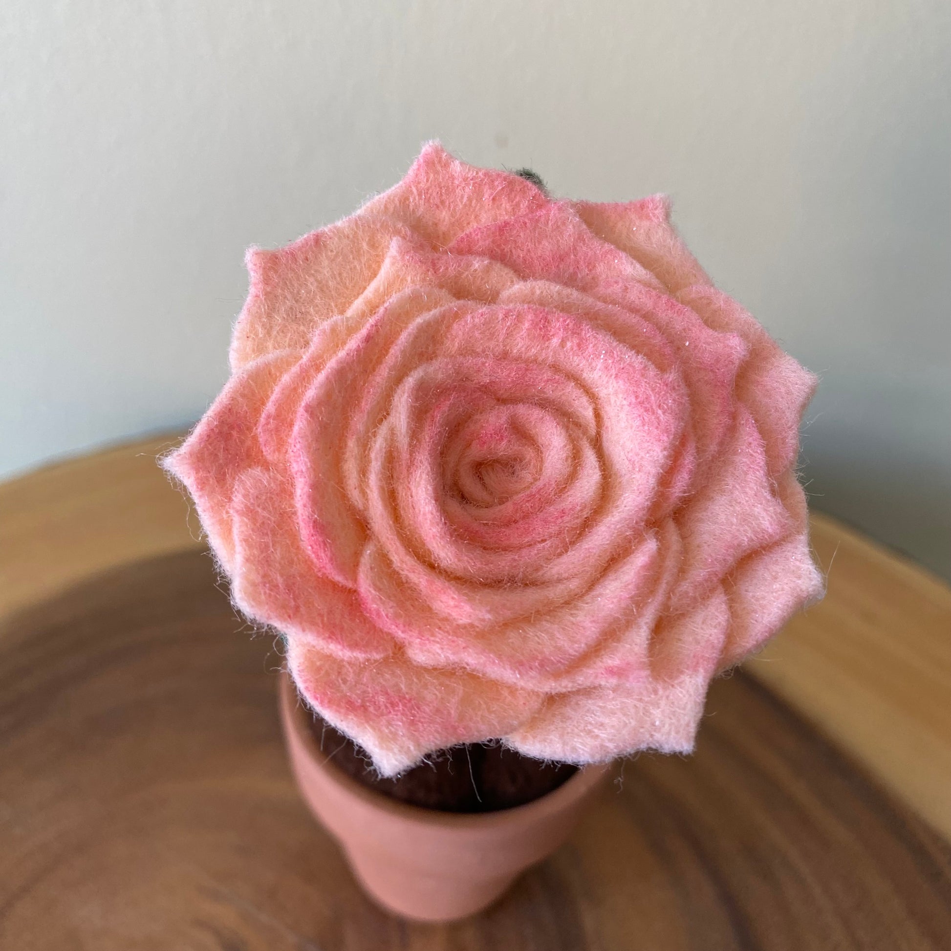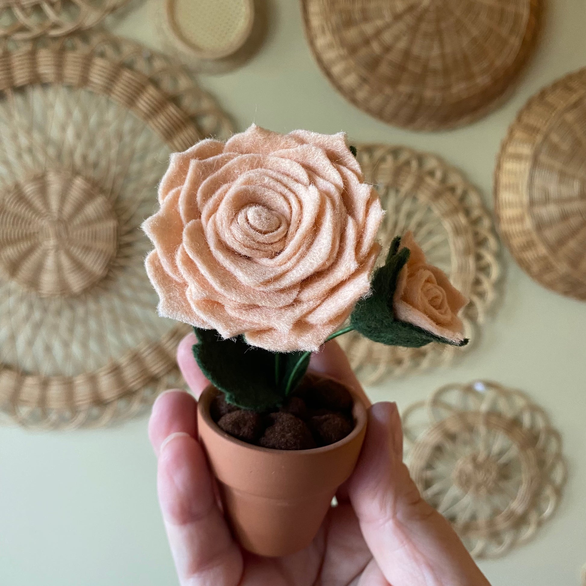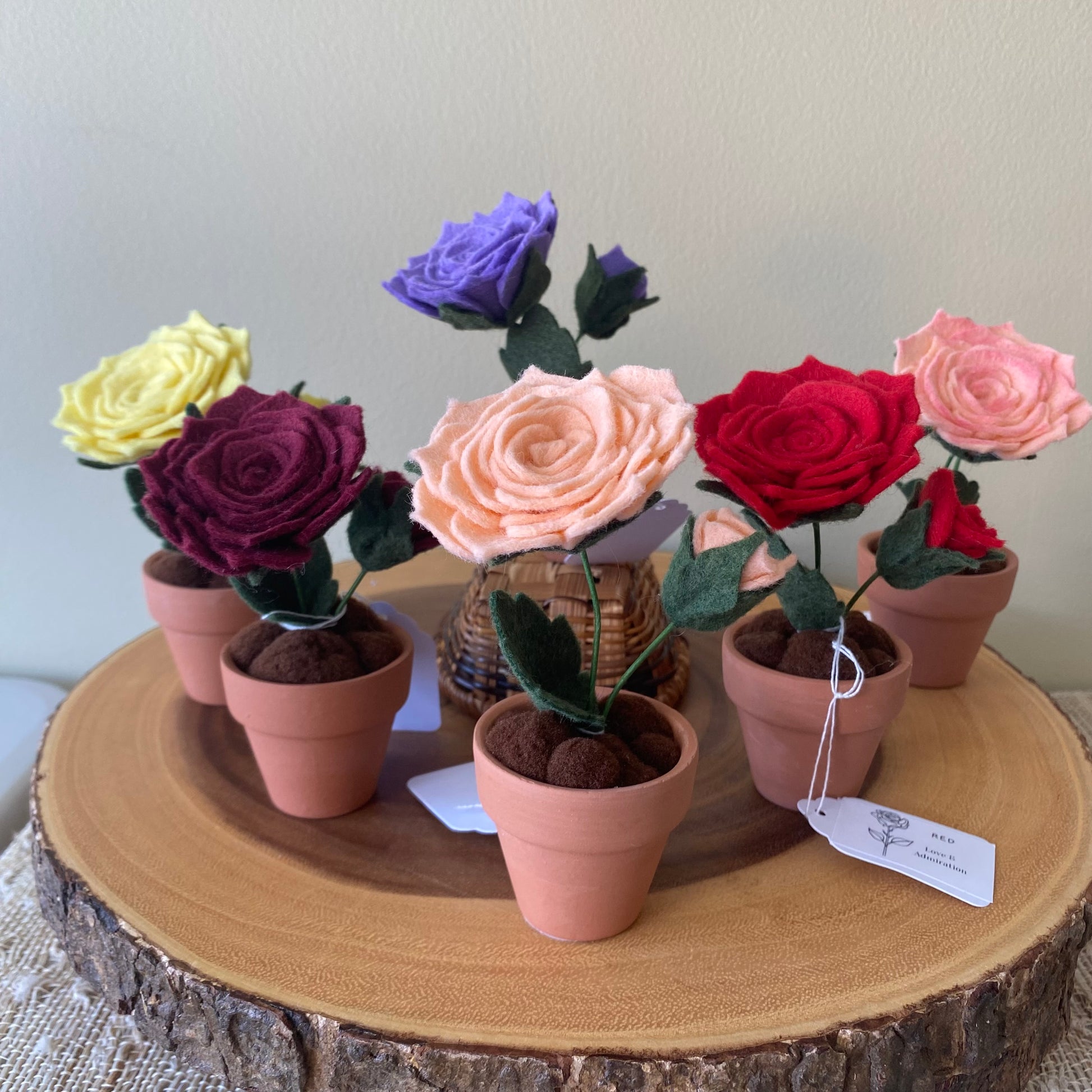 Each felt flower is in a 1.8”- 2” clay pot.