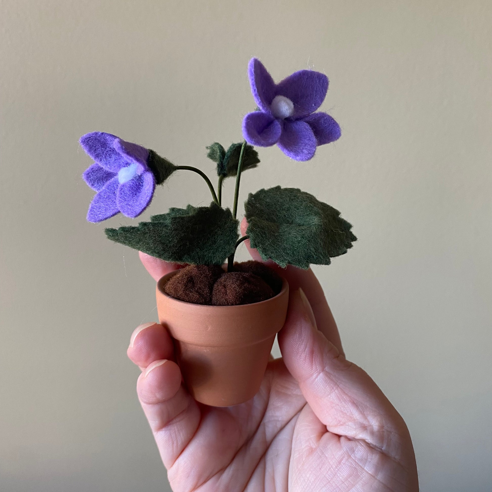 Each felt flower is in a 1.8”- 2” clay pot.