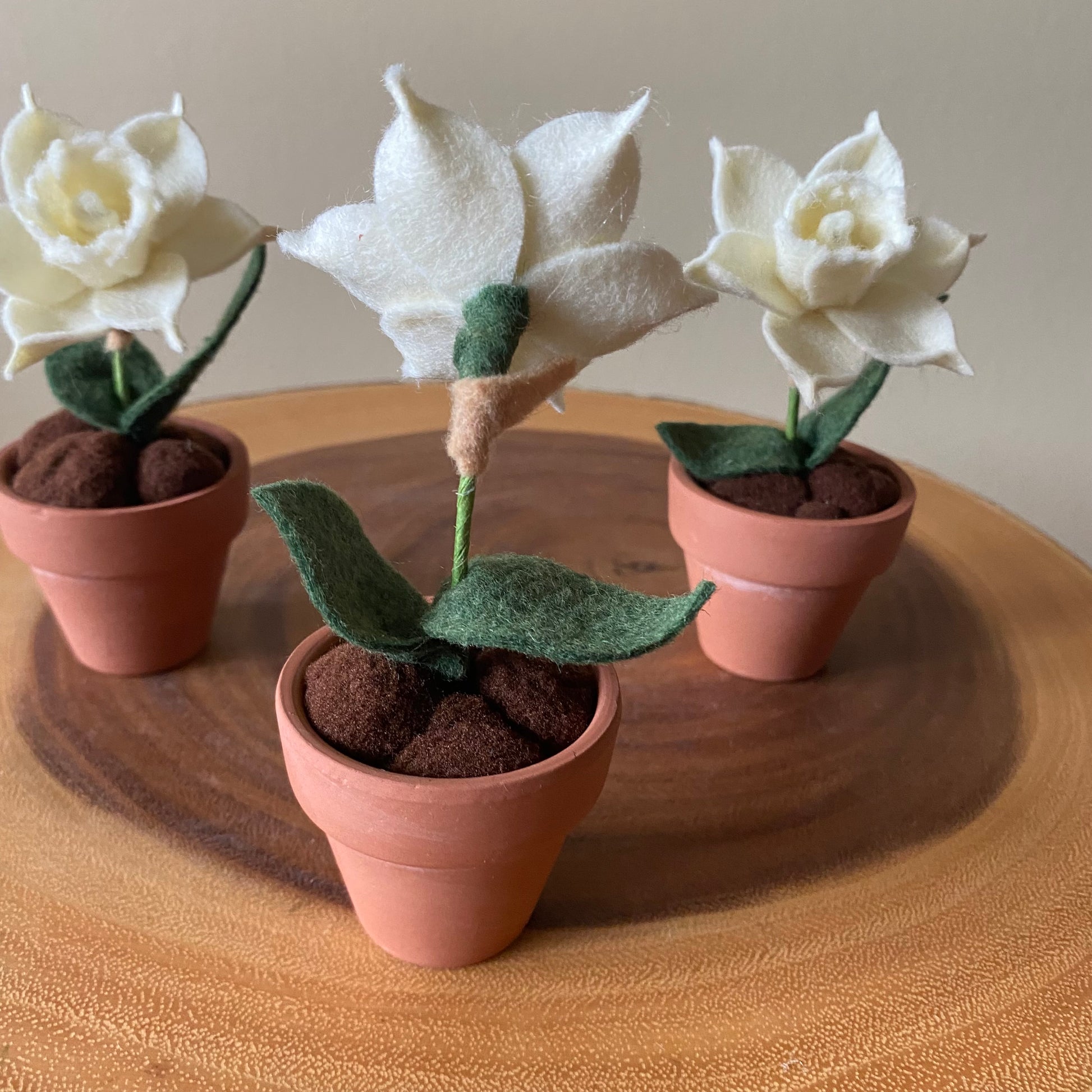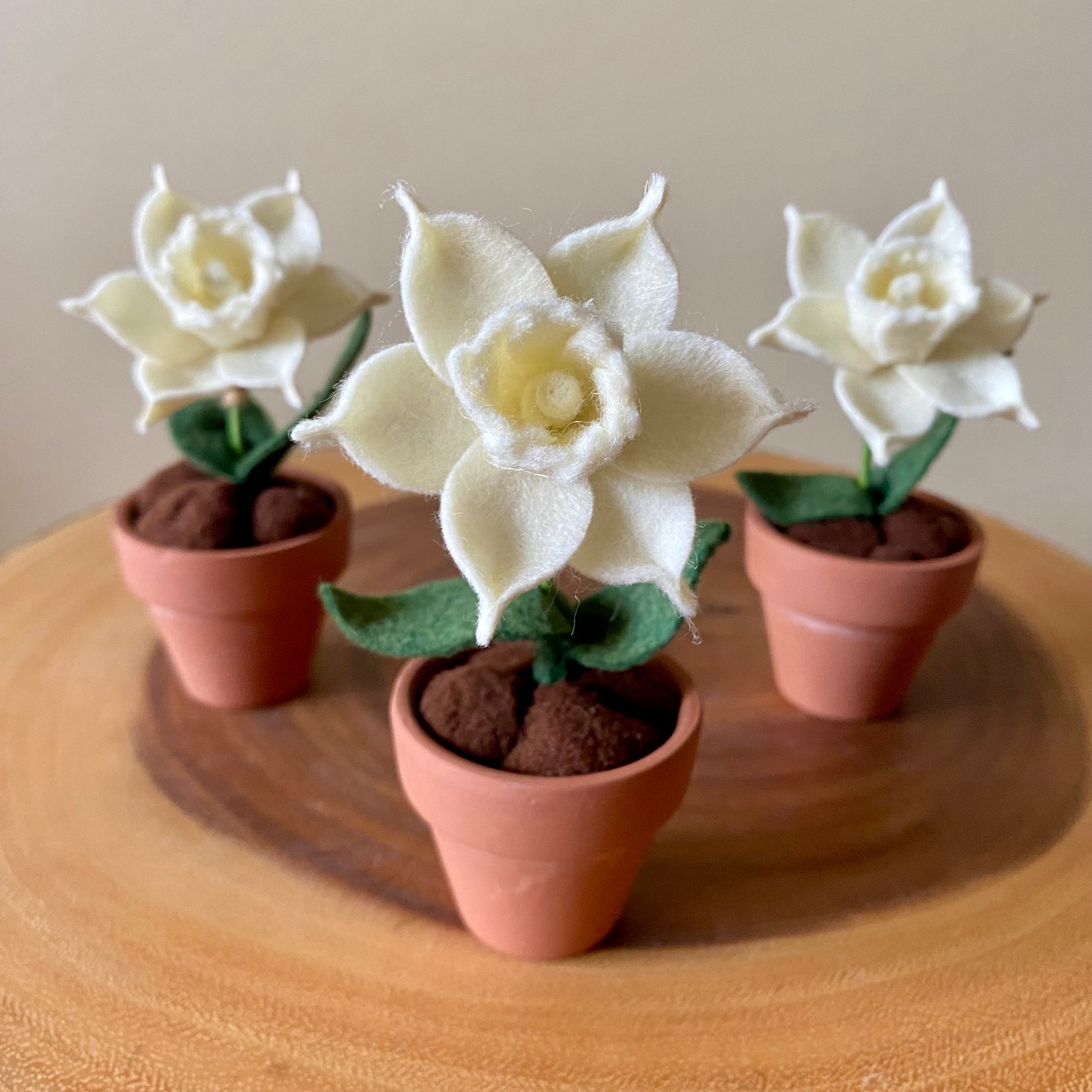 Brighten any space with this charming handmade felt daffodil! Lovingly crafted with soft wool-blend felt, this cheerful bloom sits in a 1.8” terracotta-style clay pot atop plush brown “soil.” The flower stands approximately 4.75” tall, making it the perfect size for desks, shelves, or gift baskets.