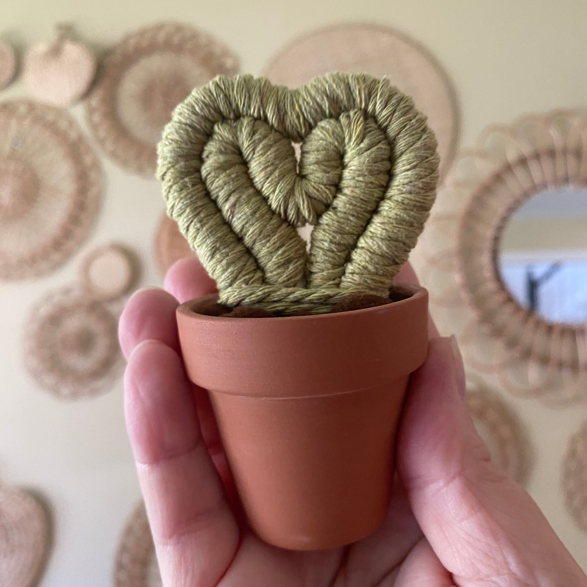Add a touch of handcrafted charm to your home with this zero-maintenance, heart-shaped macramé cactus; inspired by the Hoya kerrii “sweetheart plant”.