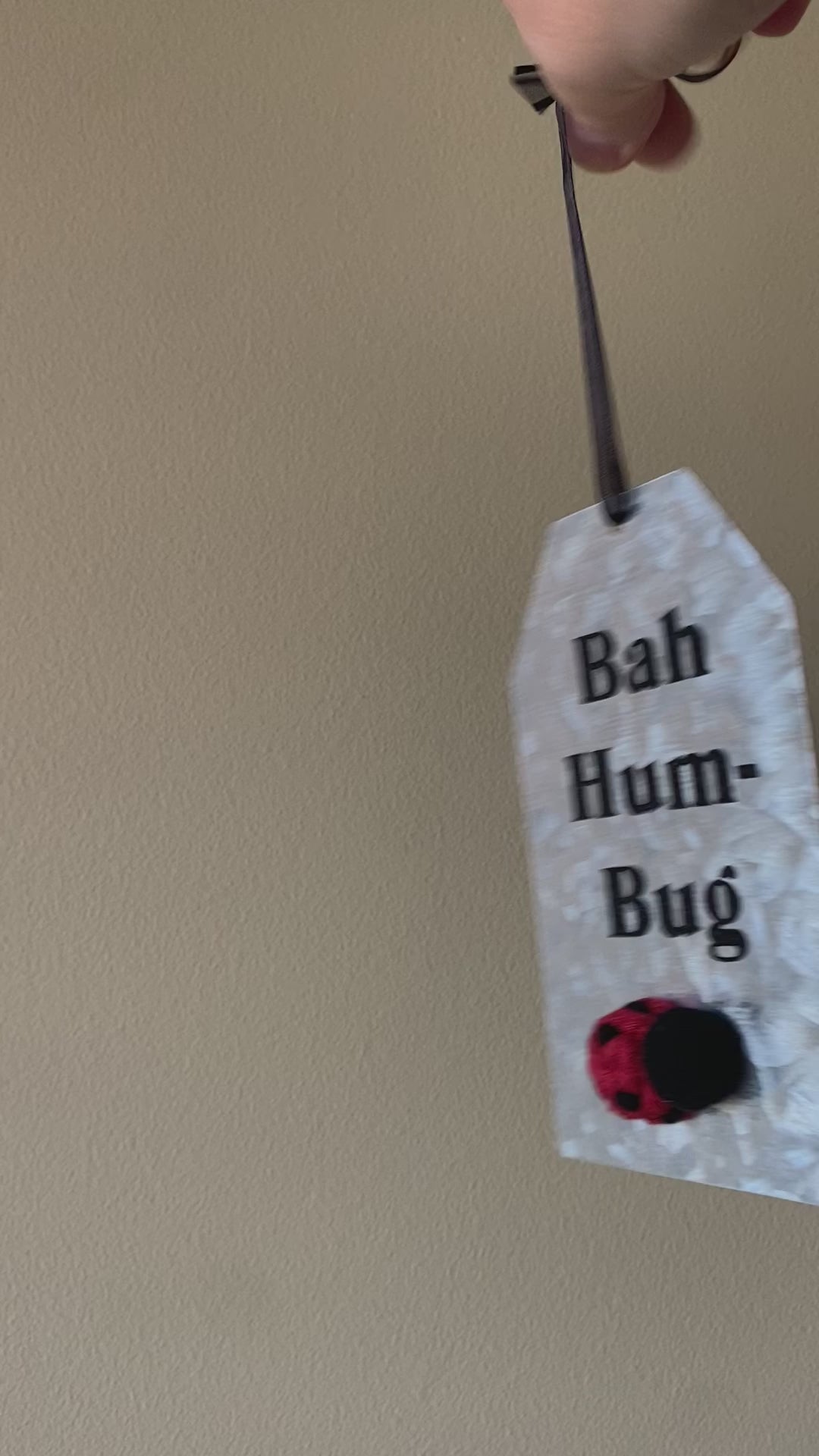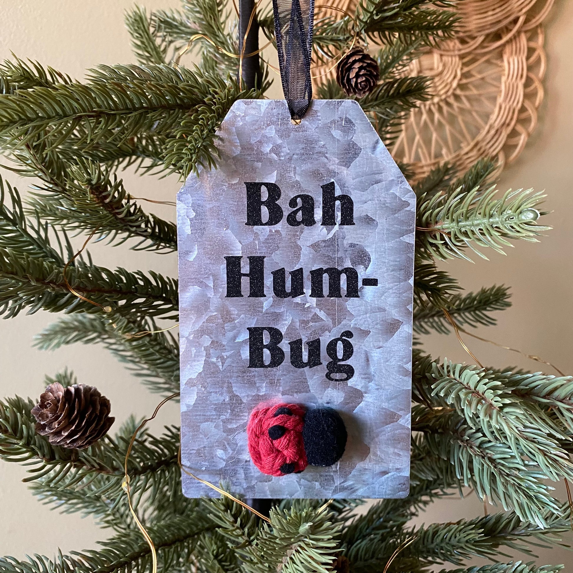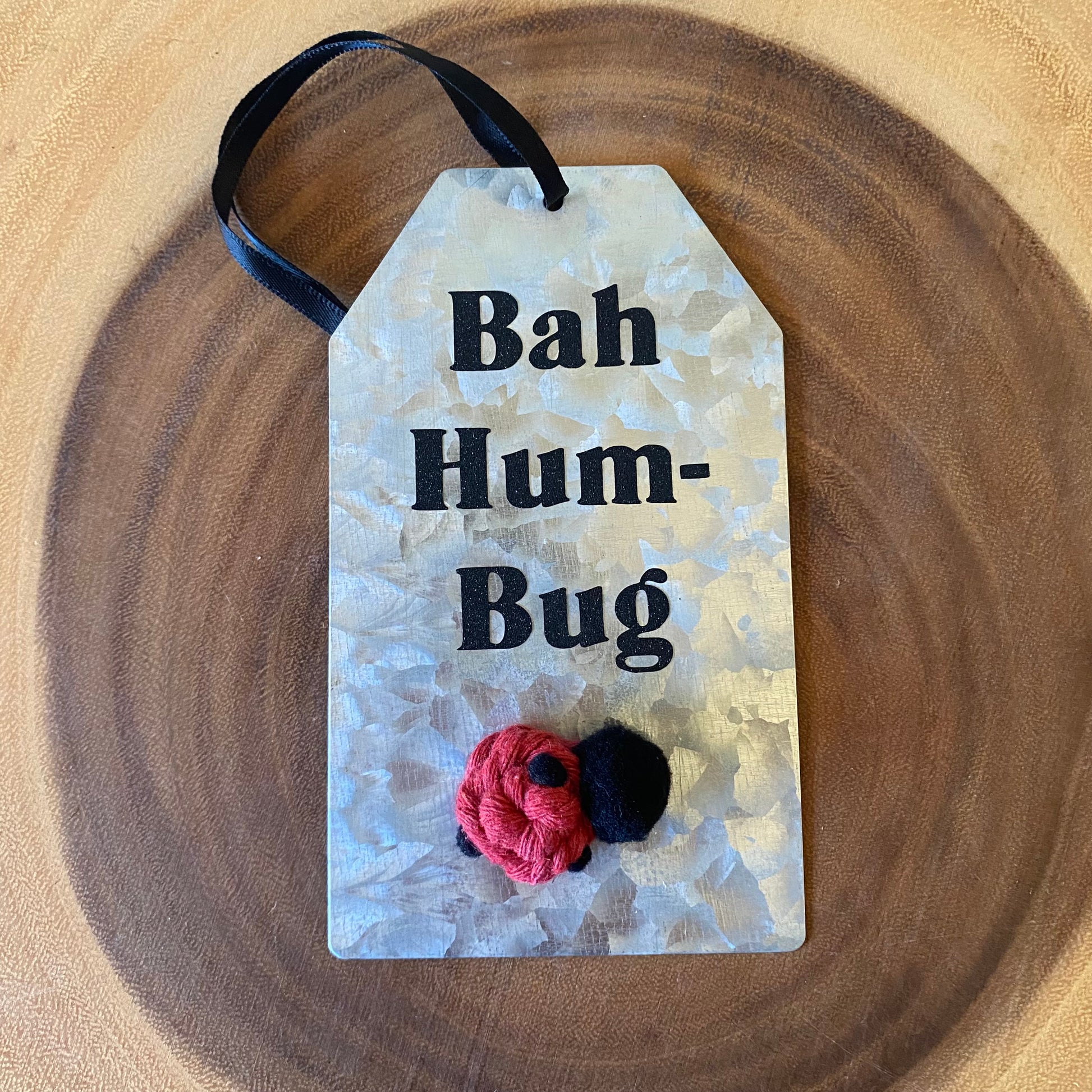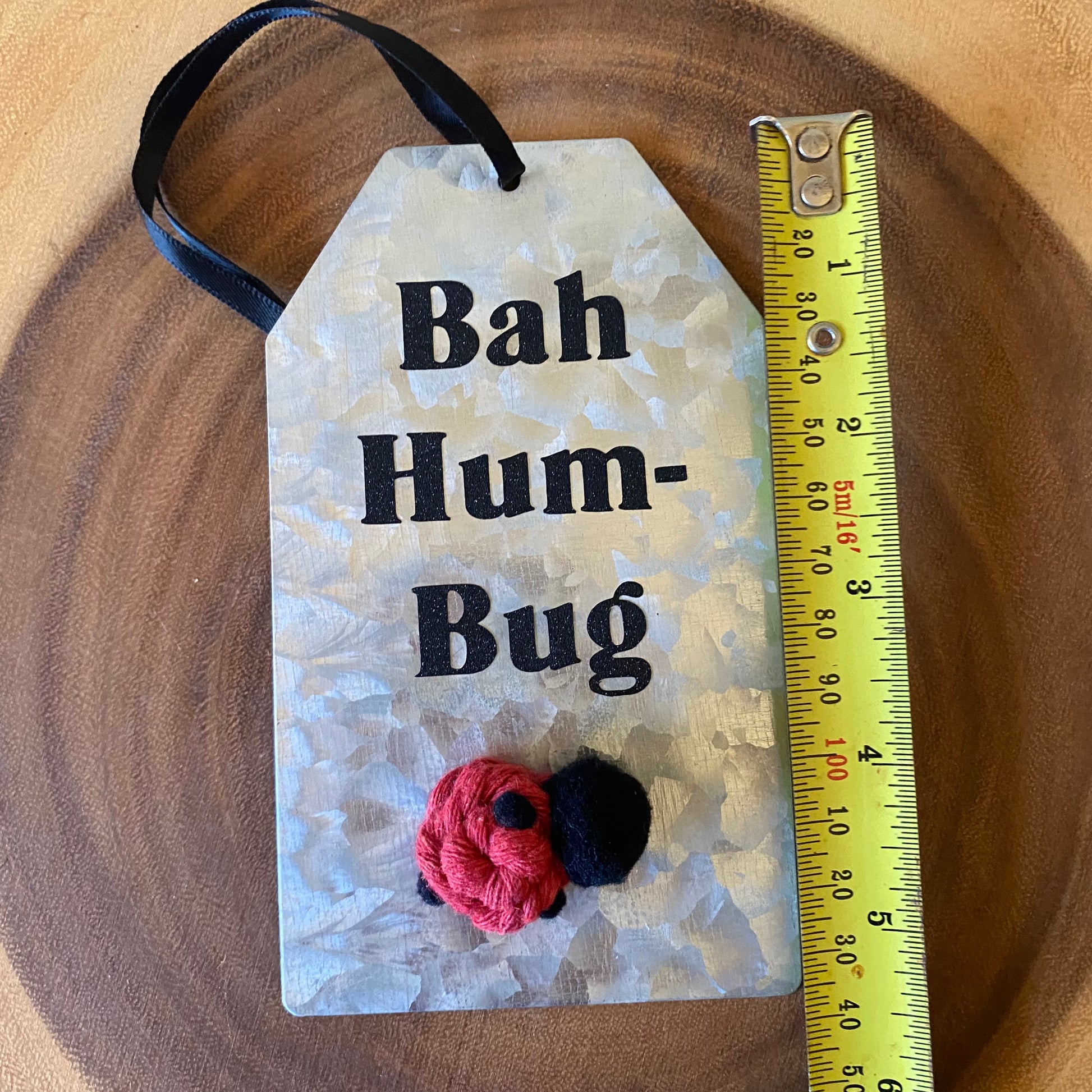 It has a frosty, textured silver-gray surface and displays the playful phrase “Bah Hum-Bug” in bold black lettering. A handmade macrame ladybug adds a touch of humour and whimsy.