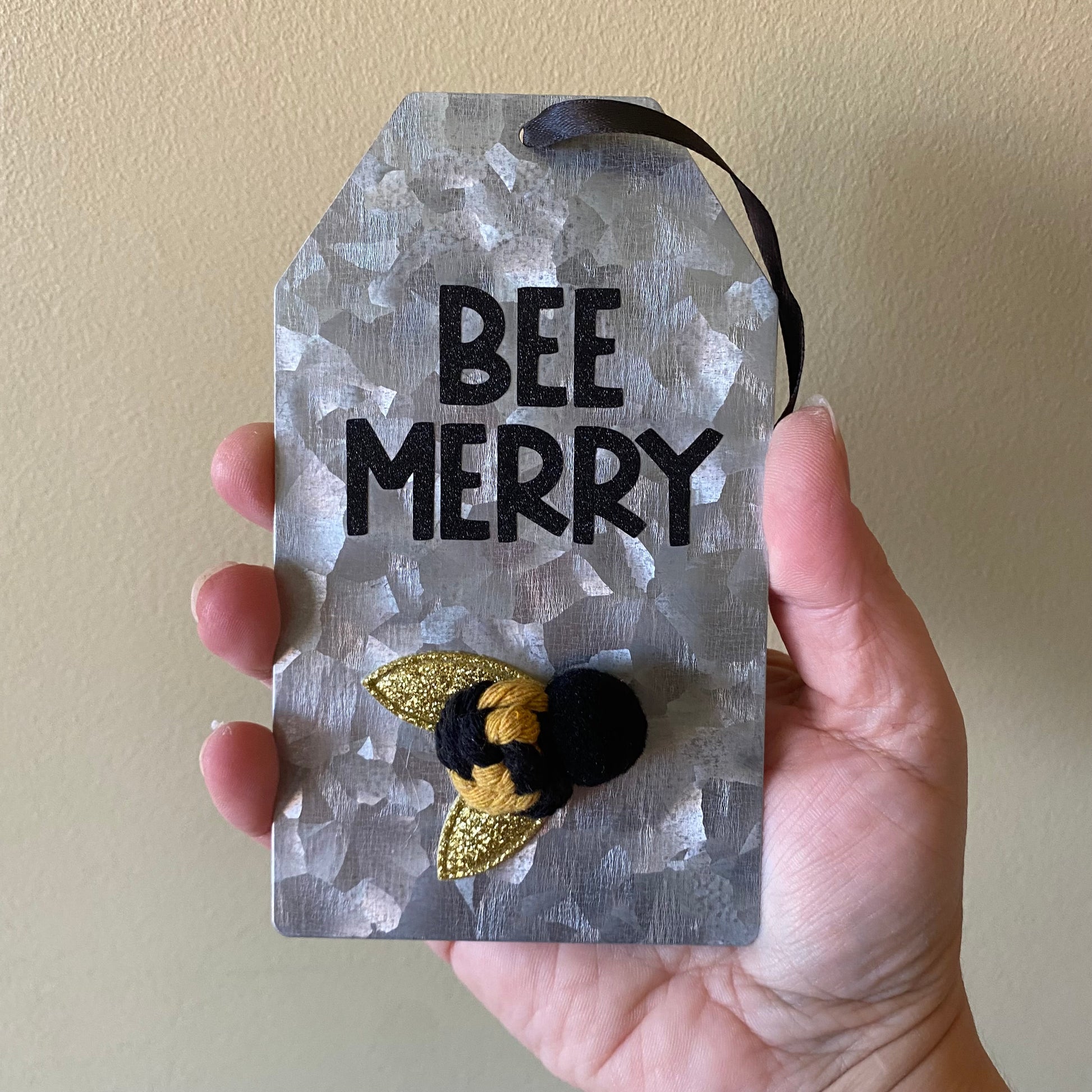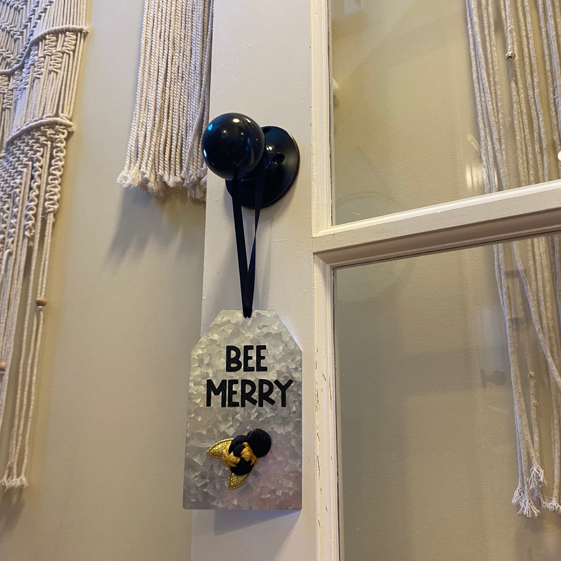This frosty silver-gray metal tag ornament features a charming macrame knotted bee (an original ForgetBknot design) and is inscribed with the playful phrase “Bee Merry.”