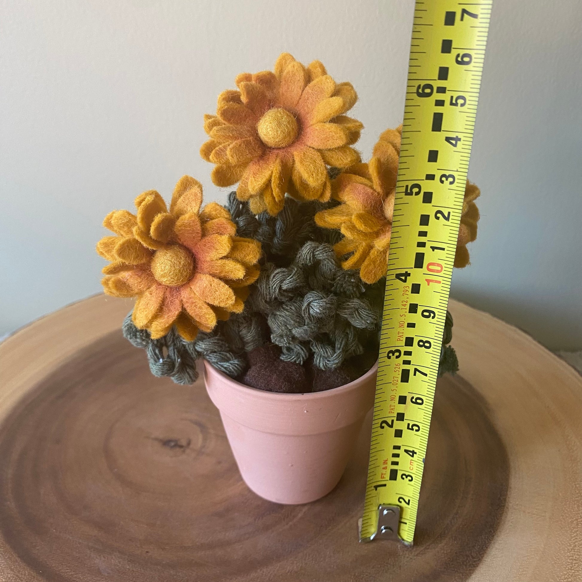 Macrame and felt chrysanthemum pot. Perfect for fall.